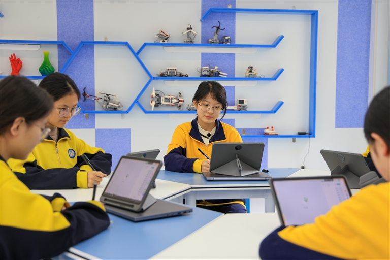 10月28日,在洛阳市伊滨区魏书生中学的“AI创想家”未来教室内,学生正在通过智慧纸笔书写、提交作业。倪睿 摄