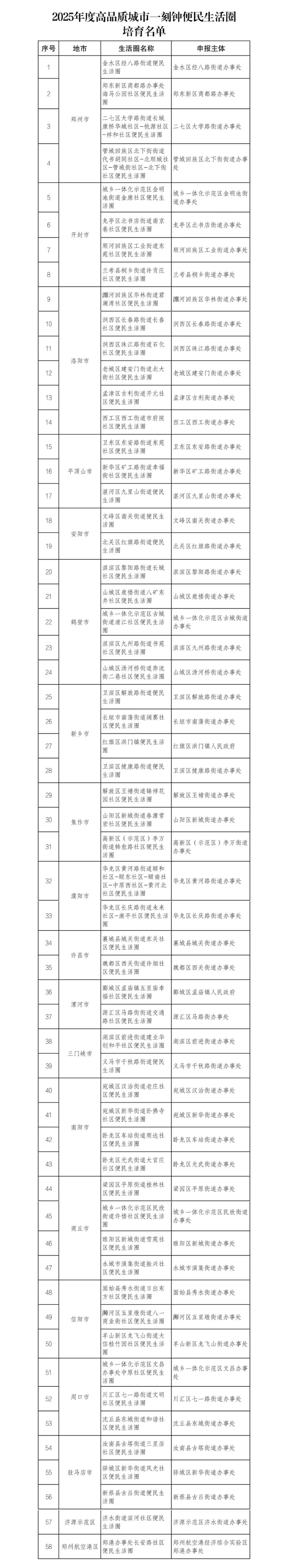 一刻钟便民生活圈,让家门口的生活需求一站满足,省时又省心。12月10日,省商务厅公示河南省2025年度高品质城市一刻钟便民生活圈培育名单,拟确定郑州市金水区经八路街道便民生活圈等58个便民生活圈为河南省2025年度高品质城市一刻钟便民生活圈培育对象。